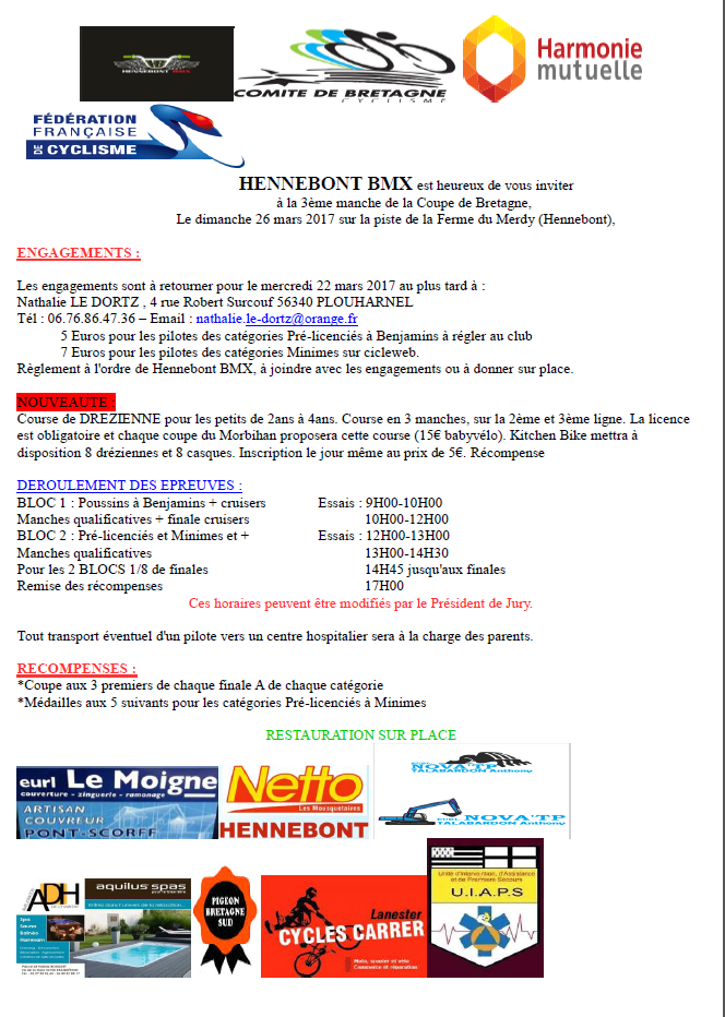 Envoi des engagements le 27 mars dernier délai. Les engagements sont à régler avant la compétition afin de faciliter la gestion. Merci.